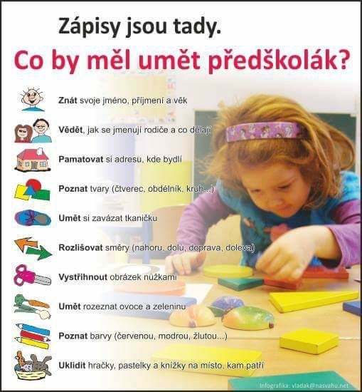 Dítě má pozitivní postoj ke škole a učení, těší se do školy, rád si hraje na školu, má zájem o nové věci, klade hodně otázek. |